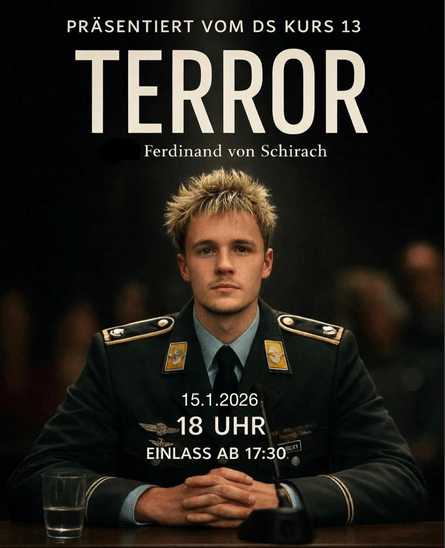 Darf man Leben gegen Leben abwägen, und ist das eine Frage der Zahl? Mit dieser schwierigen Frage setzte sich der DS-Kurs der Jahrgangsstufe 13 unter Leitung von Frau Teper auseinander, der im Januar das Theaterstück „Terror“ von Ferdinand von Schirach mit großem Erfolg auf die Bühne brachte.